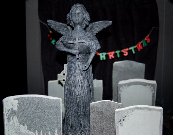 The stone angel statue in the tombstone showroom.