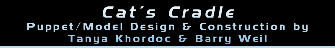 For Edward Einhorn & Henry Akona's calypso musical adaptation of Kurt Vonnegut Jr.'s novel (presented by UTC #61), Tanya & Barry were asked to design and create two bookcase-sized shelves filled with models of all of the book's locations. The character of Frank Hoenniker (played by Barry) moved a video camera on a rod through these locations with one hand, manipulating practical lighting instruments and scenic elements with the other. The results were projected onto a giant screen behind the actors to create a strong sense of place, as well as establishing Frank, a modelmaker who possesses a world-destroying weapon, as the "puppetmaster" behind the scenes of the action.